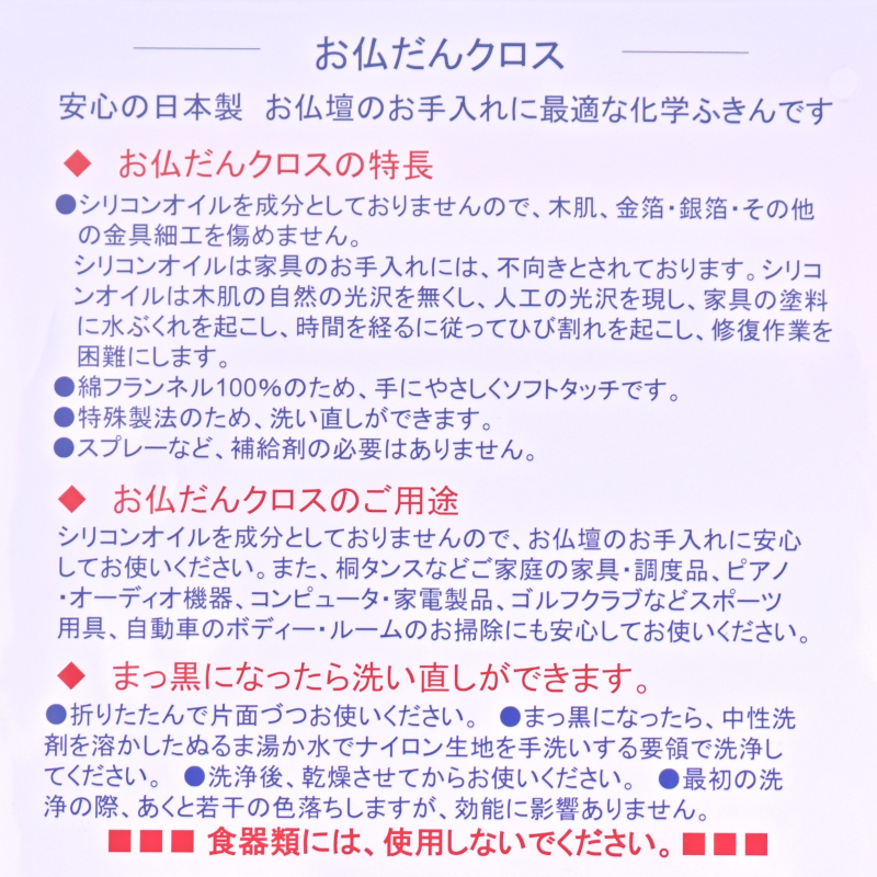 安心の日本製 お仏壇のお手入れに最適な化学ふきんです